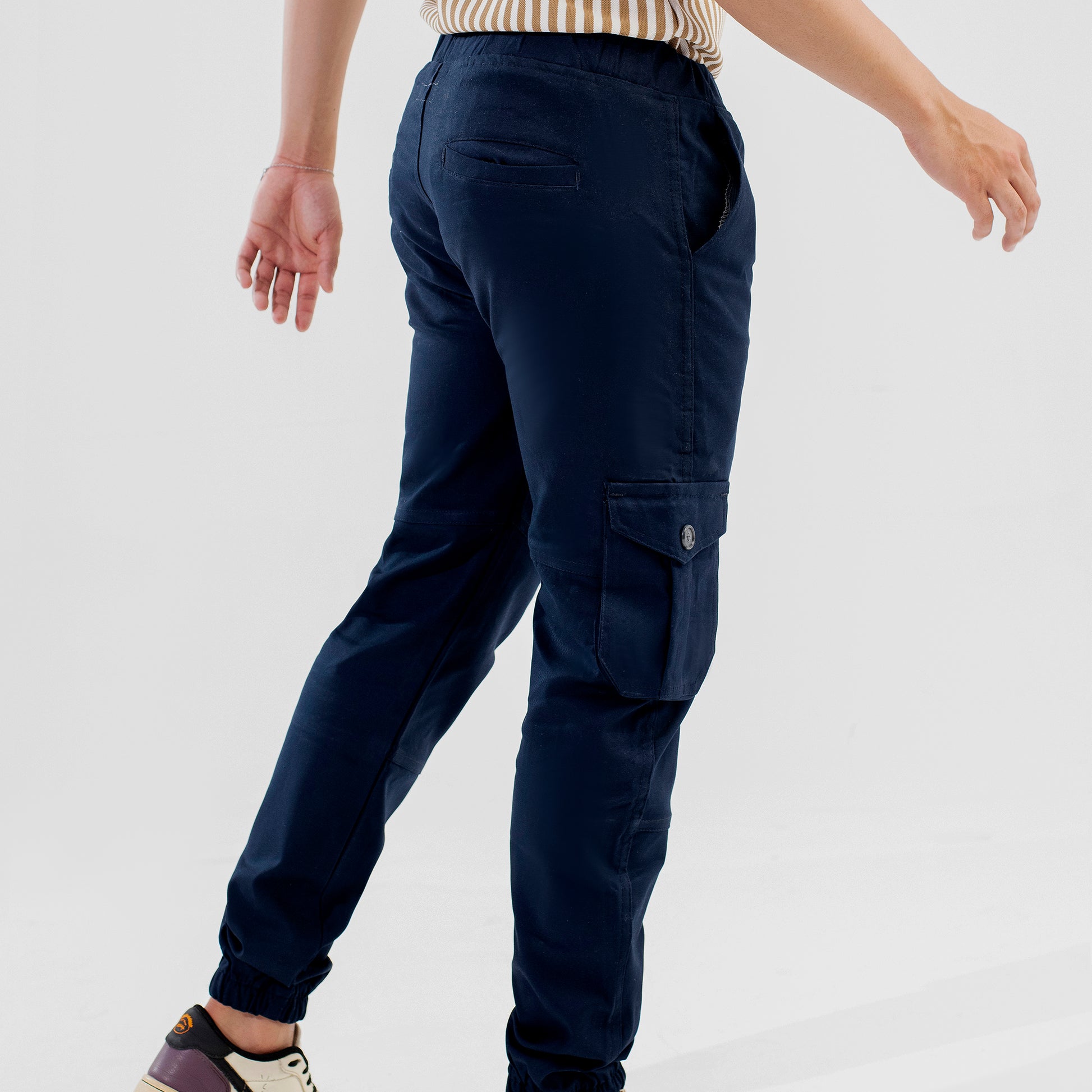 Tapered-fit cargo pants with adjustable waist and ankle cuffs.