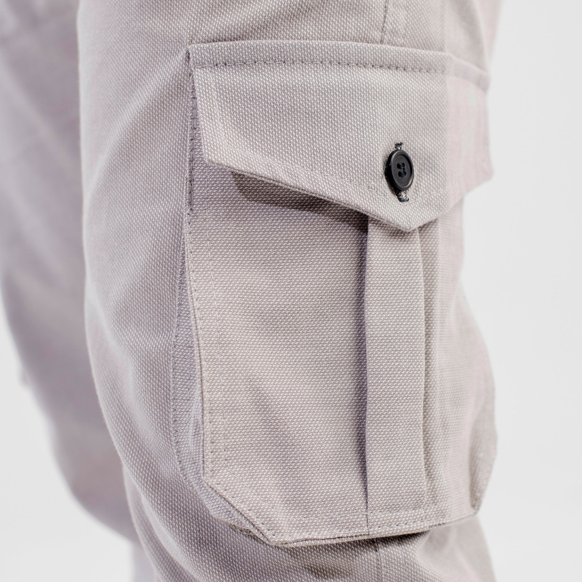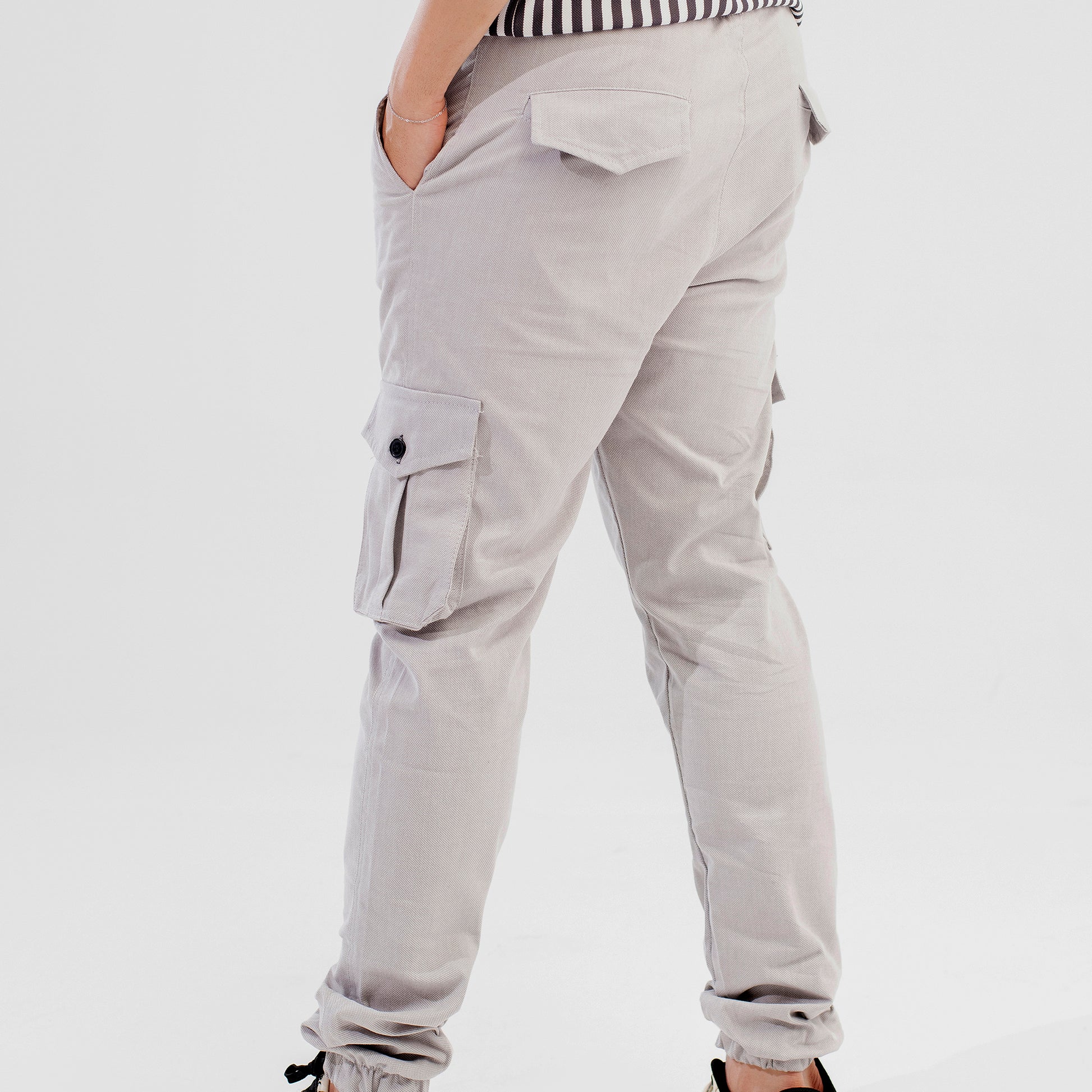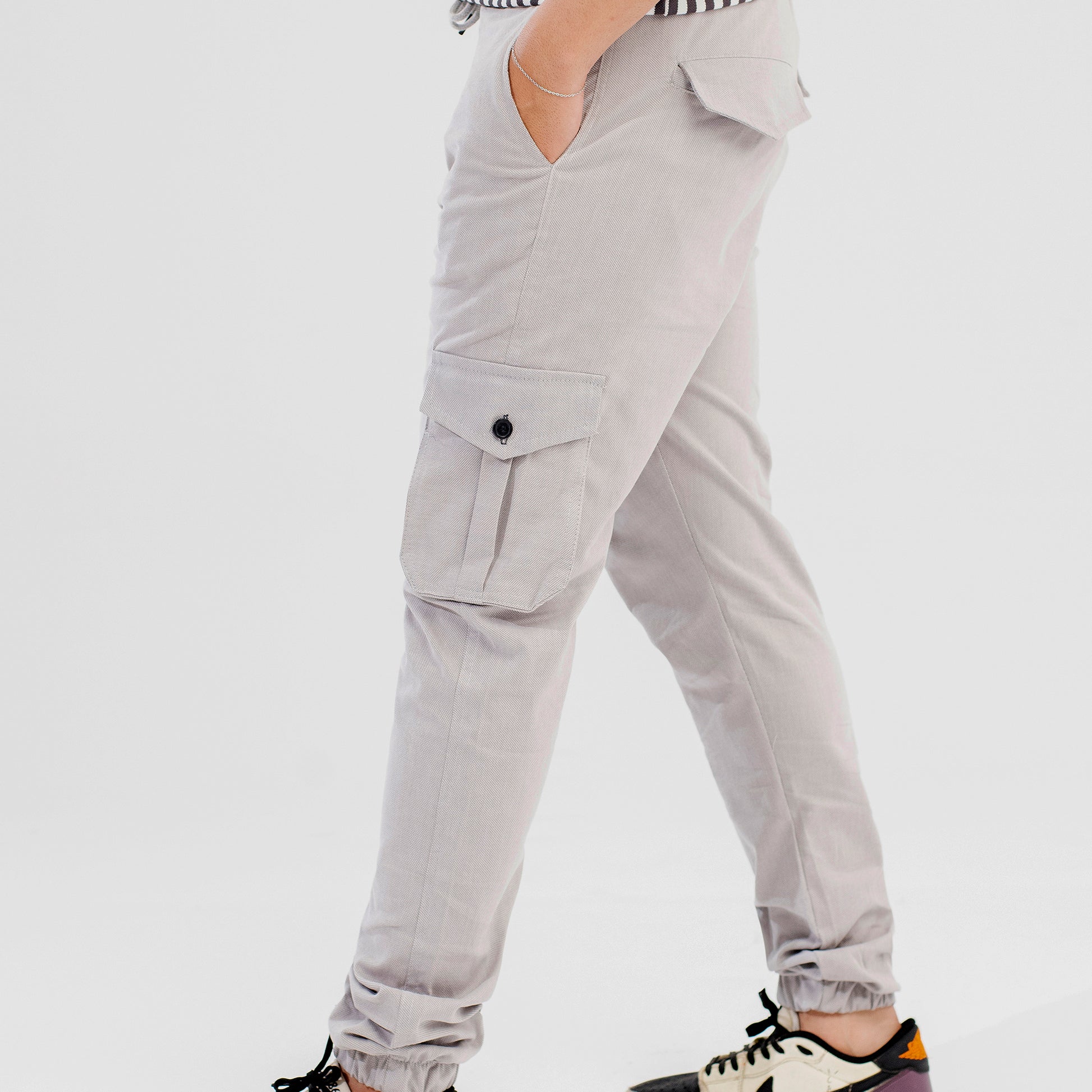 Tapered-fit cargo pants with adjustable waist and ankle cuffs.